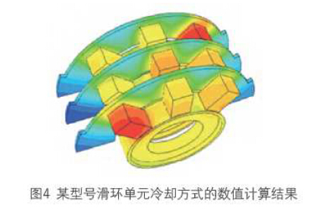同時,對該型號電滑環(huán)采用數(shù)值計(jì)算的方法進(jìn)行分析,之后可以將計(jì)算結(jié)果與測試結(jié)果進(jìn)行比對,通過這種計(jì)算與實(shí)驗(yàn)相結(jié)合的方法來分析其冷卻系統(tǒng)的性能。溫度分布的數(shù)值計(jì)算結(jié)果如圖4所示。